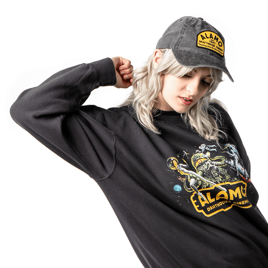 Browse our attractive array of cozy sweatshirts to cover your torso, featuring designs inspired by your favorite movies and your favorite place for film, food, and fun, the Alamo Drafthouse.