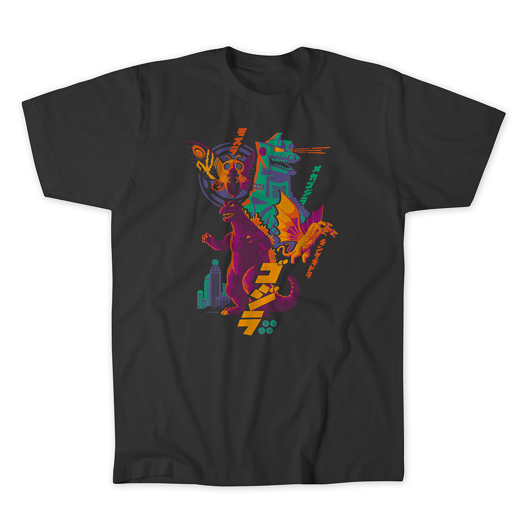 Suit up, the monsters are coming. This limited-edition black t-shirt, with art by Tom Whalen, showcases Godzilla, Mothra, Mechagodzilla, and King Ghidorah in electrifying city-smashing scenes in vivid color. Perfect for movie lovers and kaiju fans alike, this shirt won't be around for long. Pre-order now and own a piece of cinematic monster history.